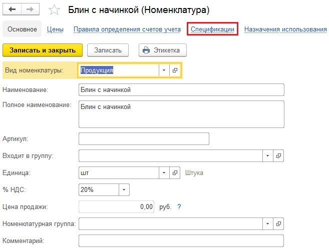 Теперь кликайте на «Создать», предварительно нажав на «Специализация». Укажите нужные для изготовления товара полуфабрикаты. Предположим, Блин с начинкой 1 единица из одной порции фарша и одного пустого блинчика.
