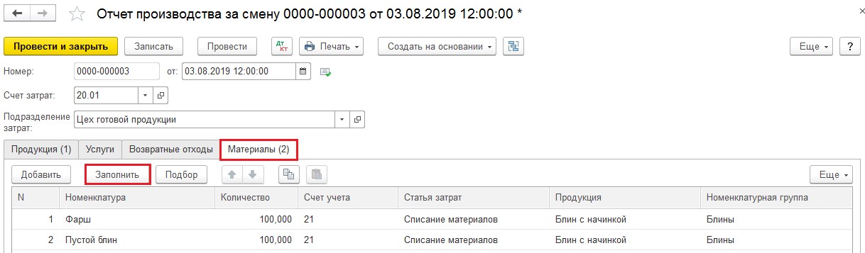 После в разделе «Материалы» кликнуть на строчку «Заполнить». Система самостоятельно определит нужные полуфабрикаты или материалы на списание.