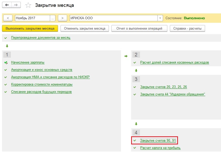 В обработке завершения месяца будет значиться операция «Закрытие счетов 91, 90».