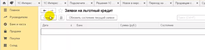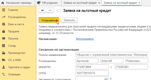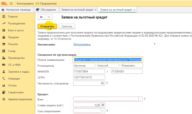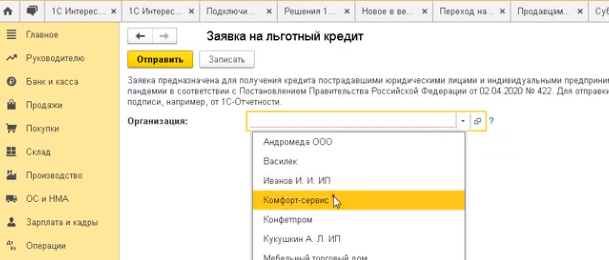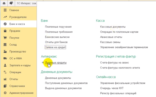 Как подготовить и отправить заявление на льготный кредит в 1С:Бухгалтерия. Открываем раздел банк и касса, антикризис, льготные кредиты.
