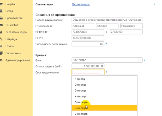 Банк выбираем из списка, предлагаемого программой. В этом списке представлены только те банки, которые по данным ФНС являются участниками программы льготного кредитования и которые поддерживают сервис 1С по онлайн отправке льготного кредита. Указываем сумму кредита в рублях и срок кредитования.