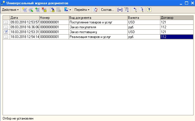 Когда будет утверждена созданная схема, пользователь получит список документов, которые были выбраны по типу. Для выполнения изменения можно повторно последовать в настройки, чтобы отредактировать графы и список документов. Работа с универсальным журналом ничем не отличается от обычного. Можно также будет открывать документы, изменять их, настраивать, создавать новые и тому подобное.