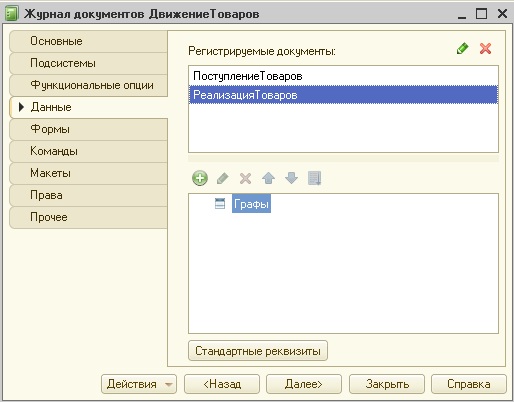 • Перейти в меню «Данные». Это вкладка, где следует настроить создаваемый журнал документов. Верхняя часть содержит поля, в которых следует указать наименование документов, внесенные в журнал. Для этого необходимо нажать «Изменить». В нижней части, которая называется «Графы», разработчику необходимо указать реквизиты документов, позволяющие объединить их в один столбец. Существует стандартные реквизиты, по которым происходит сортировка в 1С: Дата, Номер, Тип, Ссылка, Проведен и ПометкаНаУдаление.