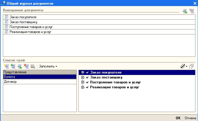 Контекстное меню или специальные кнопки помогут добавить необходимые типы документов. Рекомендуется добавлять только те документы, которые будут применяться под конкретные задачи. При добавлении только документов программа 1С предоставит таблицу, которая будет содержать минимальное количество полей для сортировки: номер, дата и тип. При добавлении других данных необходимо добавить графы с указанием реквизитов документов, входящие в них.